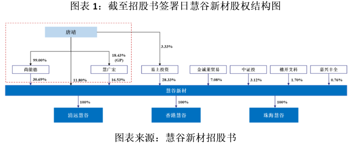 截至招股书签署日,唐靖直接持有慧谷新材11.80%的股权,并通过尚能德、慧广宏分别控制该公司30.69%、16.53%的表决权,合计控制其59.02%的表决权。另外,唐靖的配偶黄光燕为该公司的董事兼副总经理,共计持有该公司2.72%的股权,是唐靖的一致行动人。根据招股书披露的数据测算,唐靖夫妇共计持有该公司约48.89%的股权。